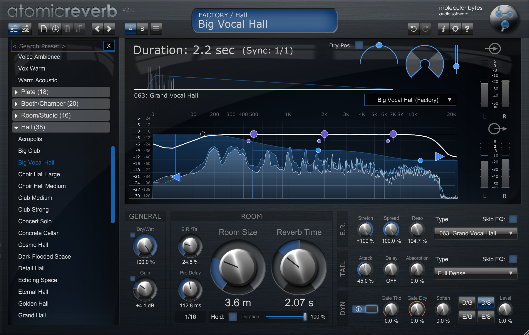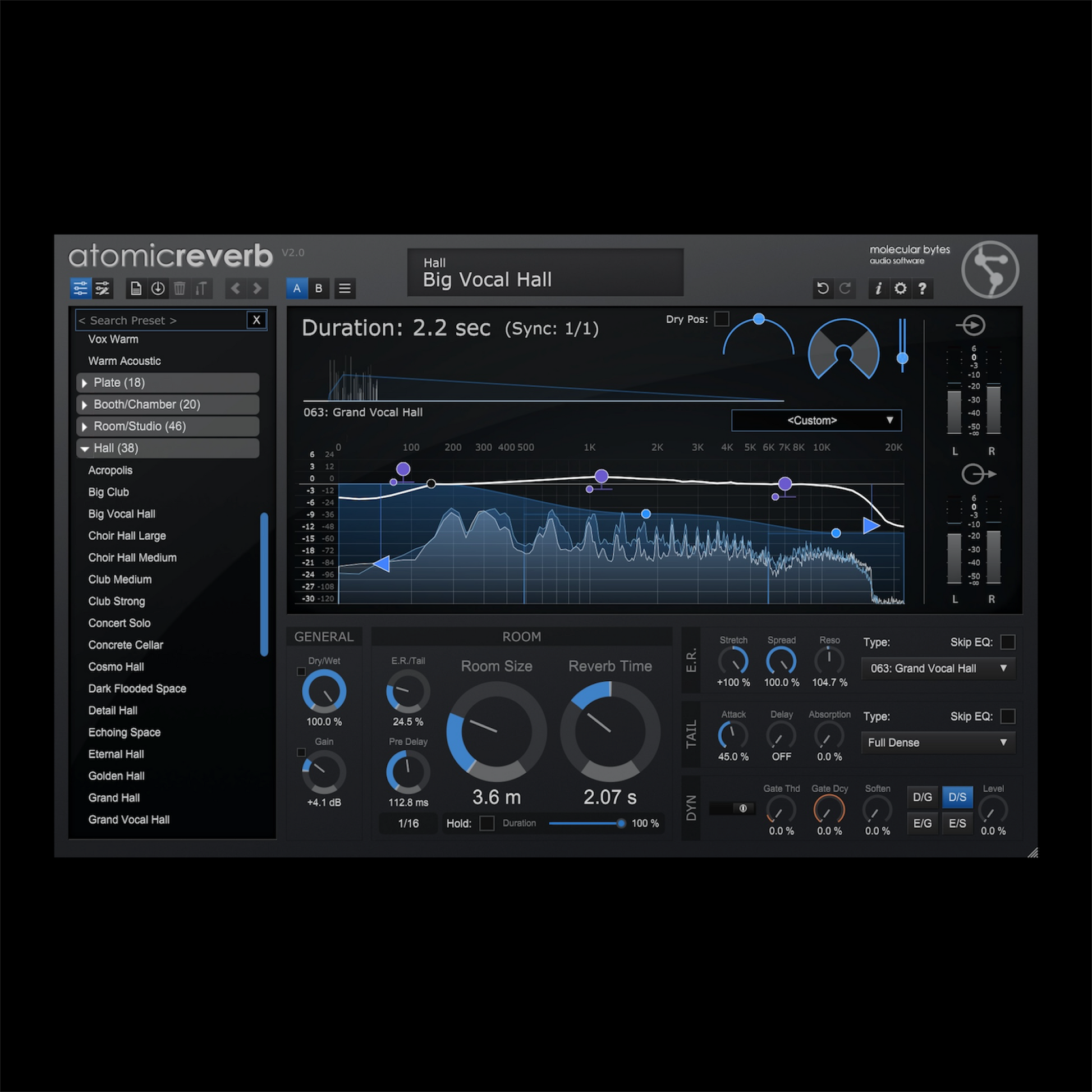 Tail design, too, goes beyond the expected. With three refined tail models, atomicReverb 2 offers distinct acoustic flavors: Hard Room simulates spaces with strong, long-lasting reflections and clear geometric definition.