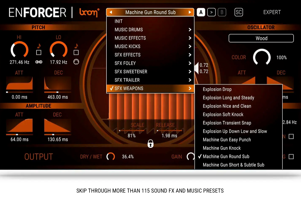 Ever wasted your time adding sub sweeteners to every single shot of a fully automatic weapon? Ever got stuck layering a kick drum with controllable and tunable low-end or enhance live drums with well defined punch? Having a hard time adding steady weight to every single footstep? Look no further, ENFORCER is the Swiss Army Knife for punch, low-end, sub power, kick… you name it.