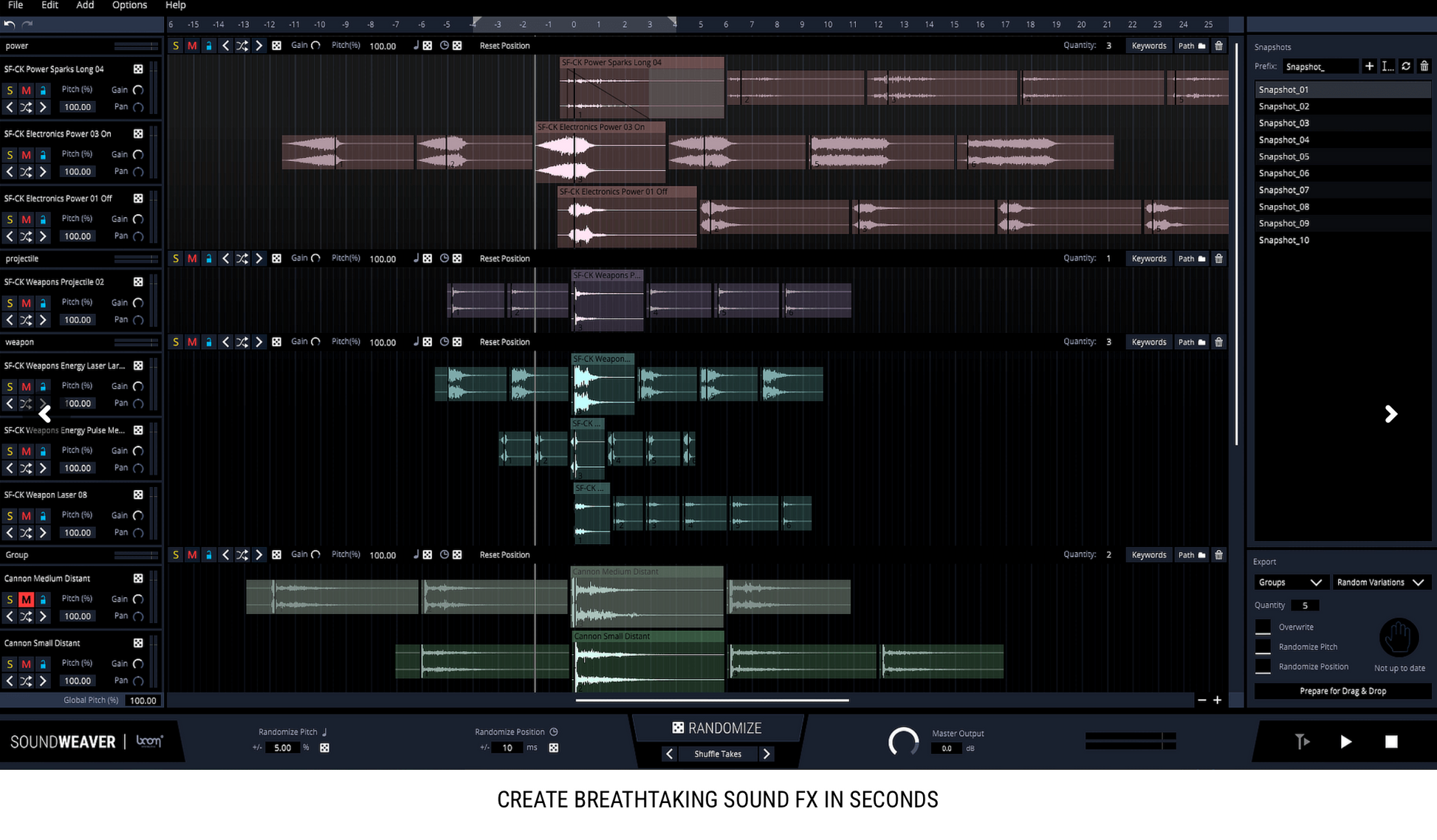 - SOUNDWEAVER can generate countless variations from your project during export via pitch, offset and take randomization.