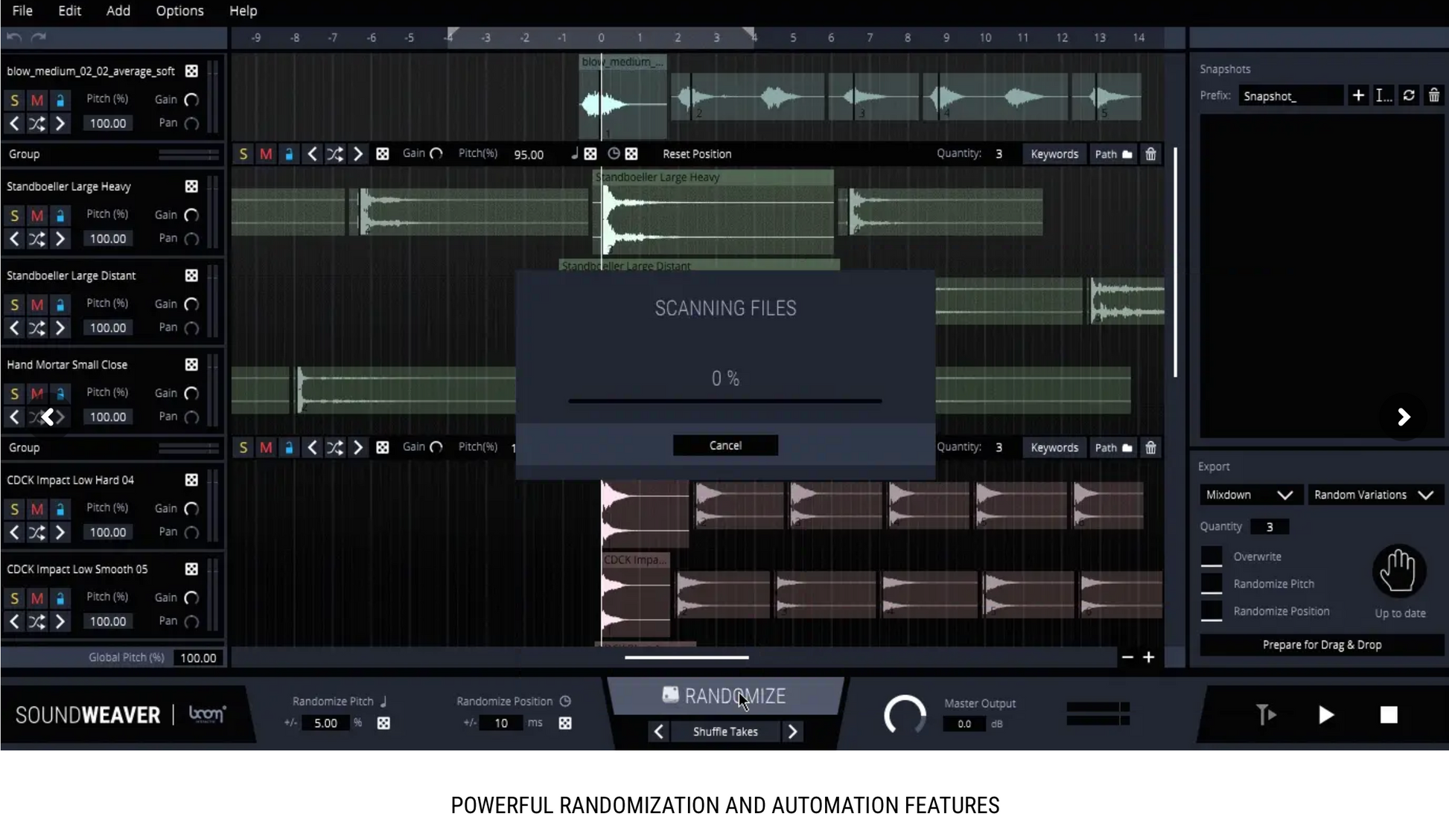 Speaking of creative process: Once your library has grown beyond a certain point, there is only so much experimenting you can do manually. SOUNDWEAVER’s powerful Randomize feature often generates combinations we’d never think of trying in the first place.