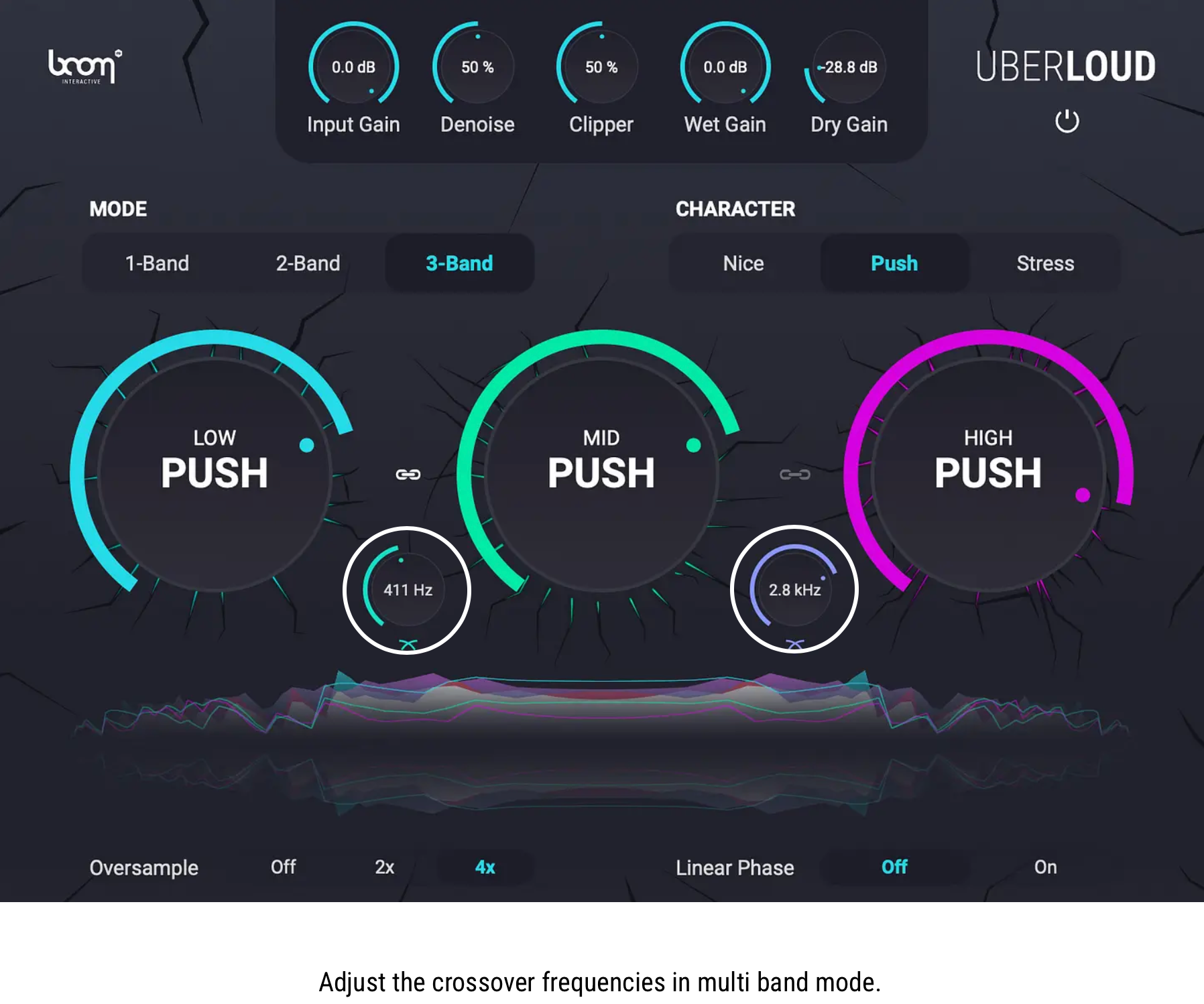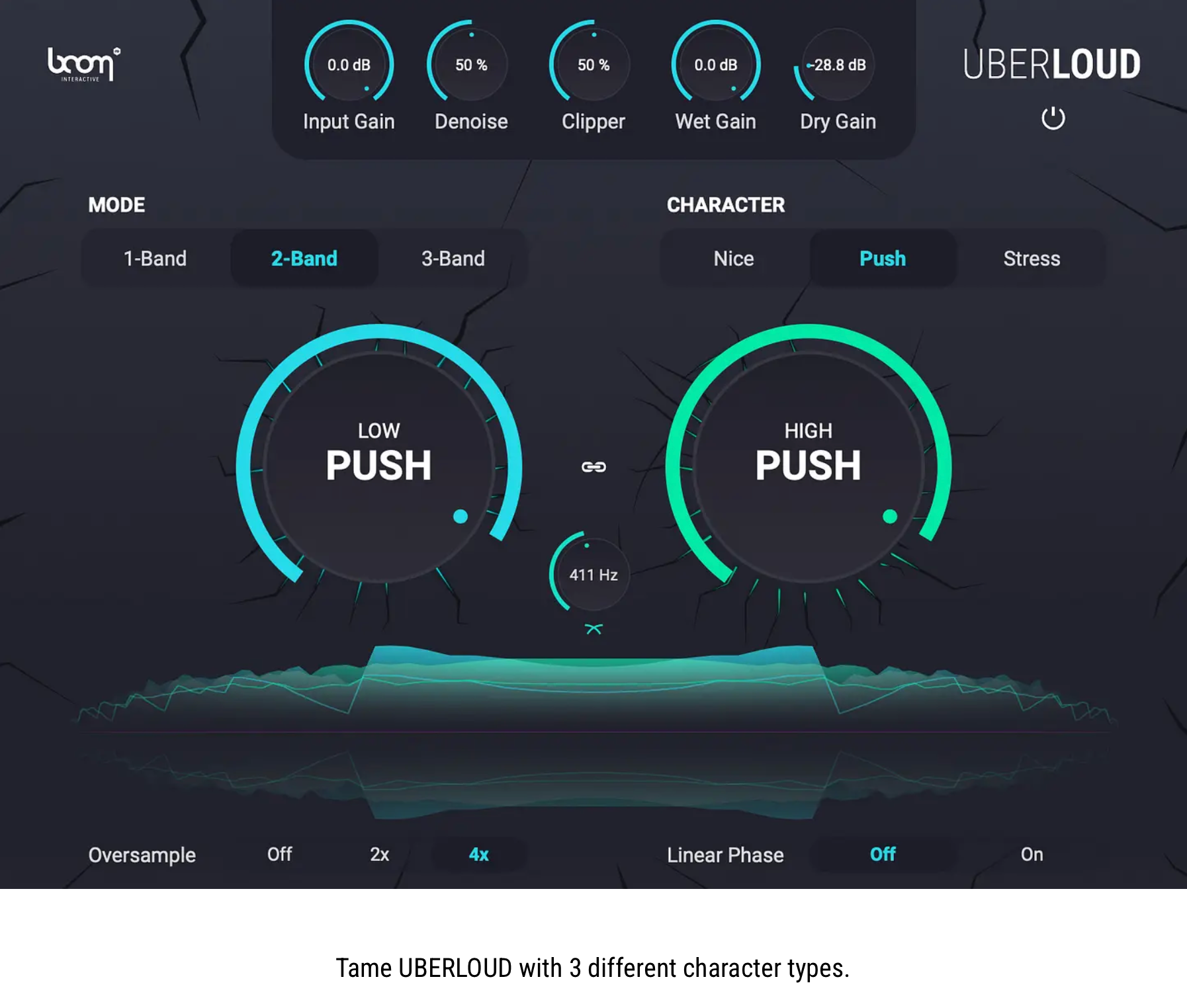 Still functioning under the basic knob principle, UBERLOUD includes multiband modes with optional linear phase filters and automatable crossover frequencies, oversampling capabilitiesfor improved quality with less aliasing, and the ability to link those knobs together for ultimate customization capabilities. It’s also got full Native Apple Silicon support.