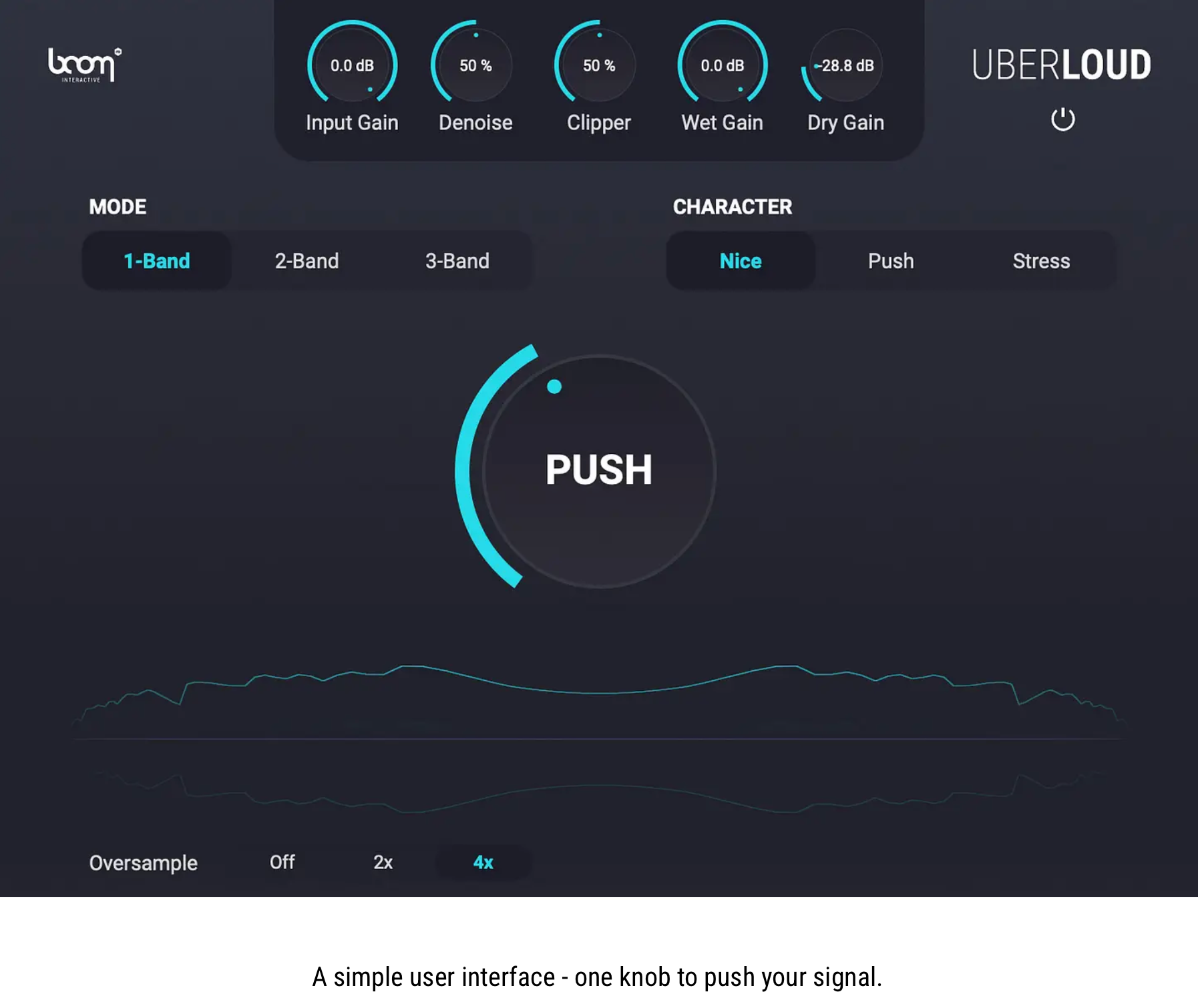 UBERLOUD is designed to make your sounds really shine through your mix in the simplest possible way. You have one to three knobs that push your signal. Use a clipper to add harmonics and a denoiser to get rid of floor noise. It’s that simple.